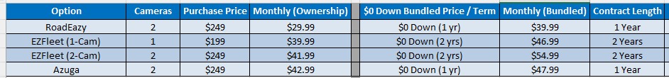 OPTION-1 RoadEazy Purchase Plan Up-front Cost: $249.00 Monthly Service: $29.99/month (month-to-month) Bundled Plan Up-front Cost: $0 Down Monthly Service: $39.99 a month (1 year contract) OPTION-2 EZFleet - 1-Camera Option (Road Only Facing) Purchase Plan Up-front Cost: $179.00 (+ tax, shipping, handling Monthly Service: $39.99/month (month-to-month) Bundled Plan Up-front Cost: $0 Down Monthly Service: $44.99/month (2-year contract) OPTION-2 EZFleet- 2-Camera Option Road and Driver Facing Purchase Plan Up-front Cost: $219.00 (+ tax, shipping, handling) Monthly Service: $41.99/month (month-to-month) Bundled Plan Up-front Cost: $0 Down Monthly Service: $46.99/month (2-year contract) OPTION-3 A.I. Azuga Purchase Plan Up-front Cost: $249.00 (+ tax, shipping, handling) Monthly Service: $42.99/month (month-to-month) Bundled Plan Up-front Cost: $0 Down Monthly Service: $47.99/month (1-year contract)
